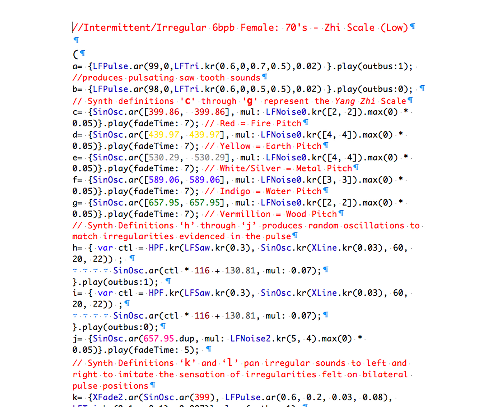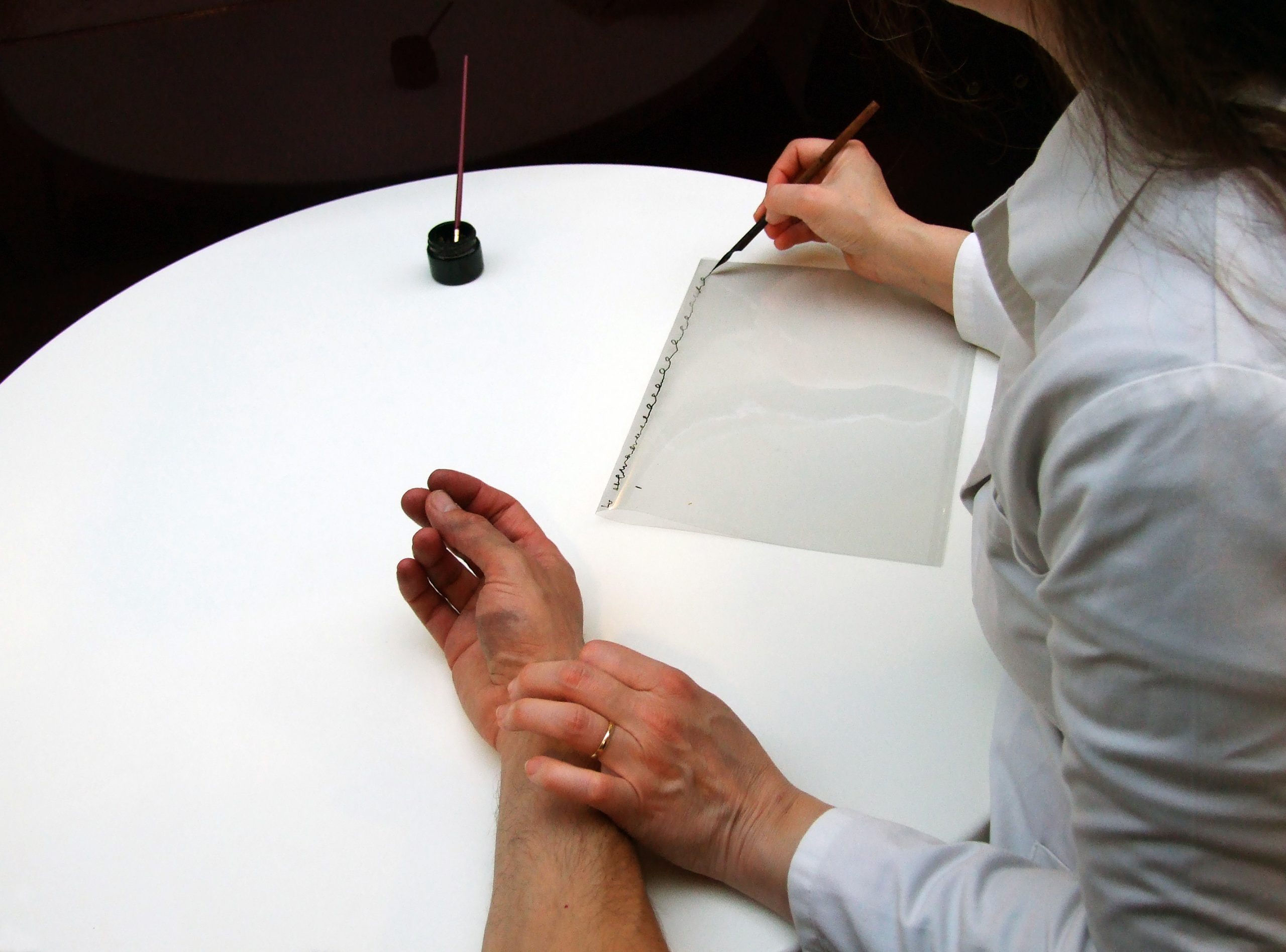 ⽶歇尔依据中医脉诊理论,在表演过程中,对每位参与者的脉象进行分析。征得参与者同意后,她为参与者们把脉,根据中医二十八种脉象图识别参与者的生理特征与模式,比如感觉像琴弦的“弦脉”,或者流动不顺畅的“涩脉”,并记录下脉搏的速度、力度等特征。⽶歇尔通过分析从人们体内感受到的这些独特的波形节奏,将其转化为定制的乐谱(手绘或彩绘乐谱)。