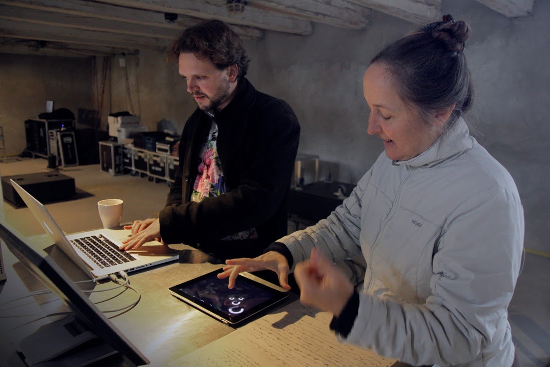 米歇尔在表演空间声景前读取参与者的脉搏数据。©⽶歇尔·刘易斯-金/4DSOUND